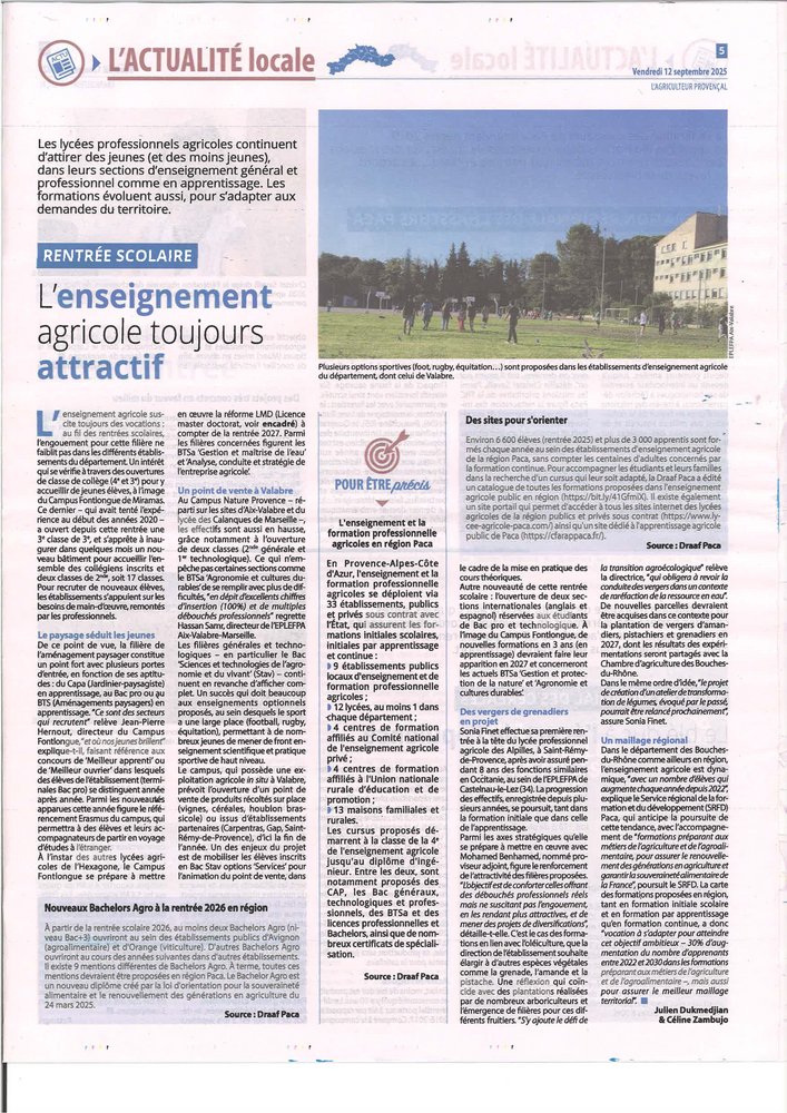 Un article concernant dans l'Agriculteur sur le Lycée de Valabre et le Campus Nature Provence.