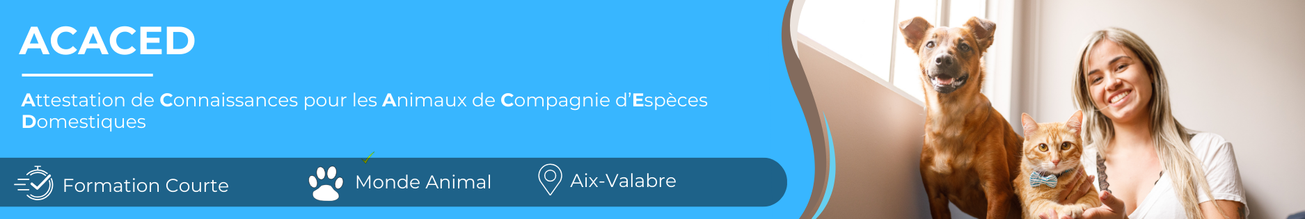 Attention :L’ACACED est une Attestation d’Etat vous autorisant à travailler avec les animaux de compagnie. C'est une formation courte (de 17h à 25h selon le format choisit) et généraliste. Le Campus Nature Provence, est un centre de formation du Ministère de l'Agriculture qui propose d'autres formations dans les métiers de l'animal, comme la formation ASV (auxiliaire Spécialisé Vétérinaire) ou la formation TAV : Transport d'animaux vivant