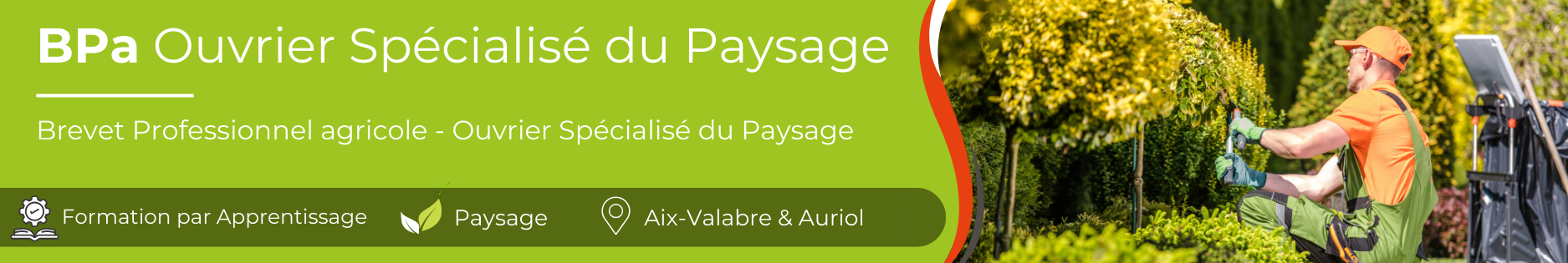 Le BPA « Ouvrier spécialisé du paysage » vise un profil d’emploi d’ouvrier paysagiste polyvalent, qui réalise différents travaux techniques spécifiques courants de mise en place et d’entretien des végétaux et de réalisation d’ouvrages d’aménagements paysagers.